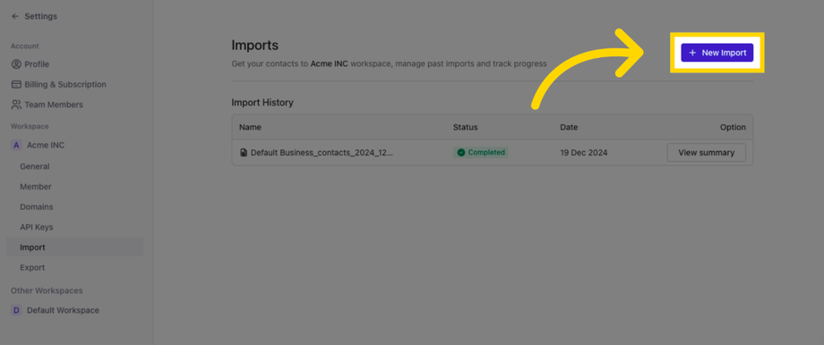 3. เริ่มเซสชันการนำเข้า contact ใหม่โดยเลือก New Import