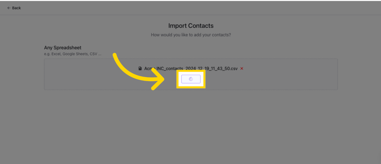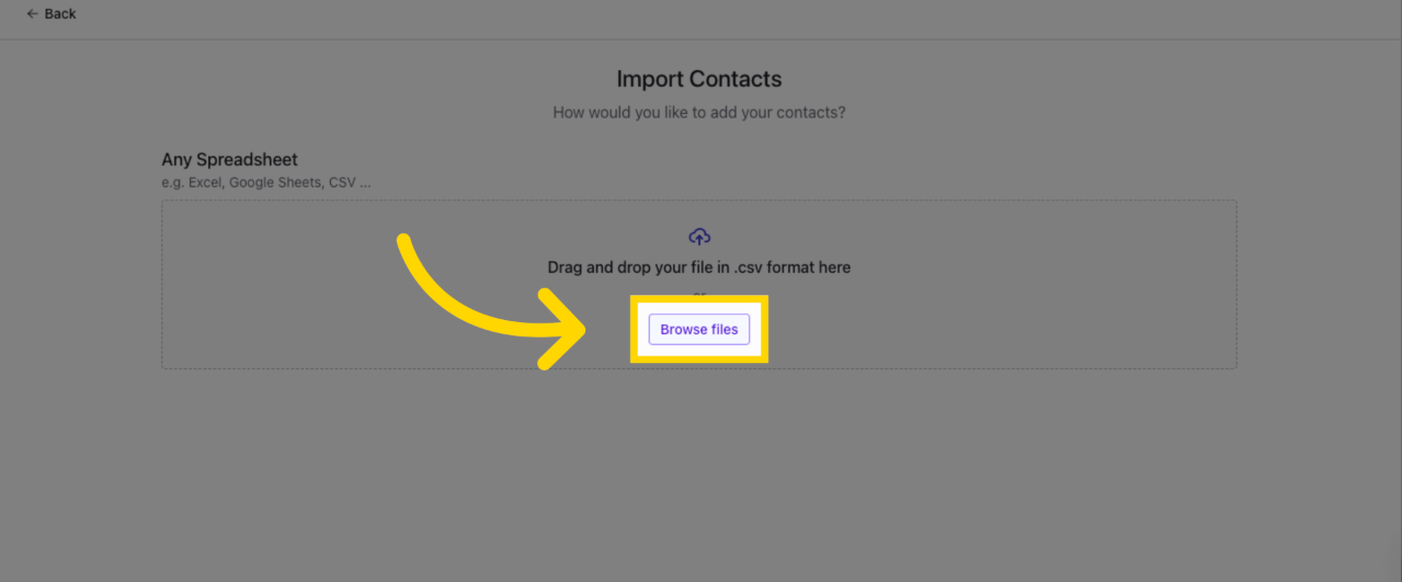 4. ค้นหาไฟล์ที่มี contacts ที่คุณต้องการนำเข้าโดยคลิก Browse Files เลือกไฟล์จากคอมพิวเตอร์ของคุณ (Excel, Google sheets, CSV ฯลฯ)