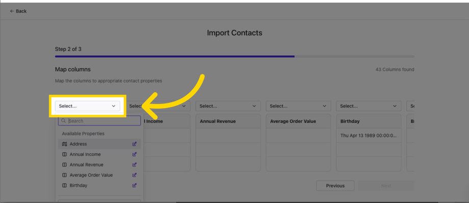 6. จับคู่ฟิลด์ในไฟล์ของคุณกับฟิลด์ที่เกี่ยวข้องใน SwipeOne (เช่น ชื่อ อีเมล โทรศัพท์) คุณยังสามารถสร้าง Contact Properties ใหม่ในขั้นตอนนี้ได้