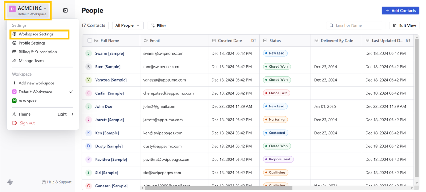 * การเชื่อมต่อโดเมนที่ถูกต้องในการตั้งค่า workspace เปิดใช้งานฟีเจอร์ต่างๆ เช่น การส่งอีเมลจำนวนมากผ่าน Campaigns และอีเมลอัตโนมัติผ่าน Workflows